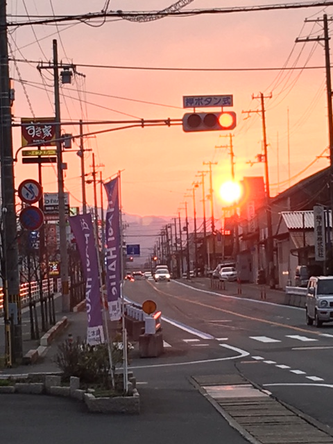 先日、帰ろうとしたら、向こうにこんなに大きな夕日が見えました。