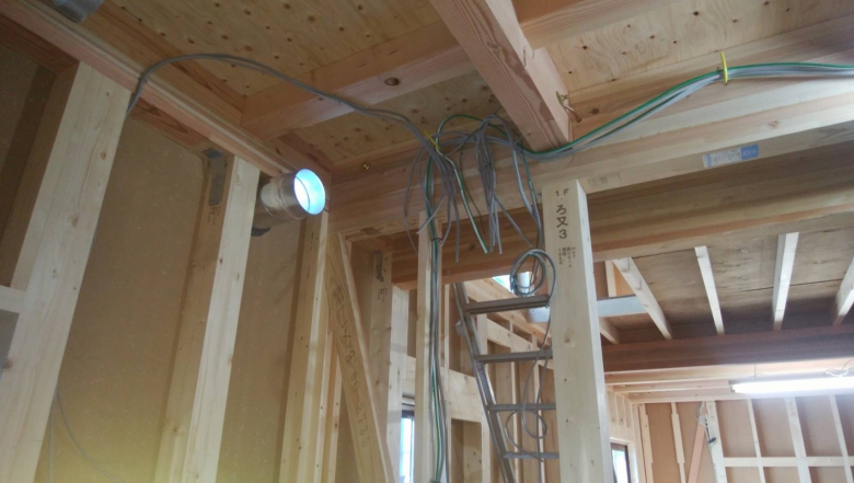 壁に隠れて見えない電気ケーブルや換気ダクト、コンセントBOXやスイッチBOXの設置は、上棟して骨組みが出来上がり10日後ぐらいを目安に工事をさせていただきます。
