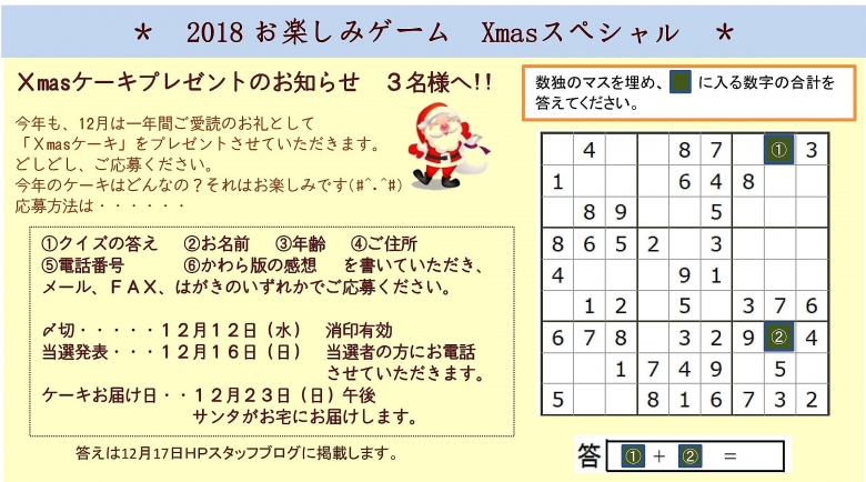 ケーキプレゼント当選発表!!*2018お楽しみゲーム Xmasスペシャル*