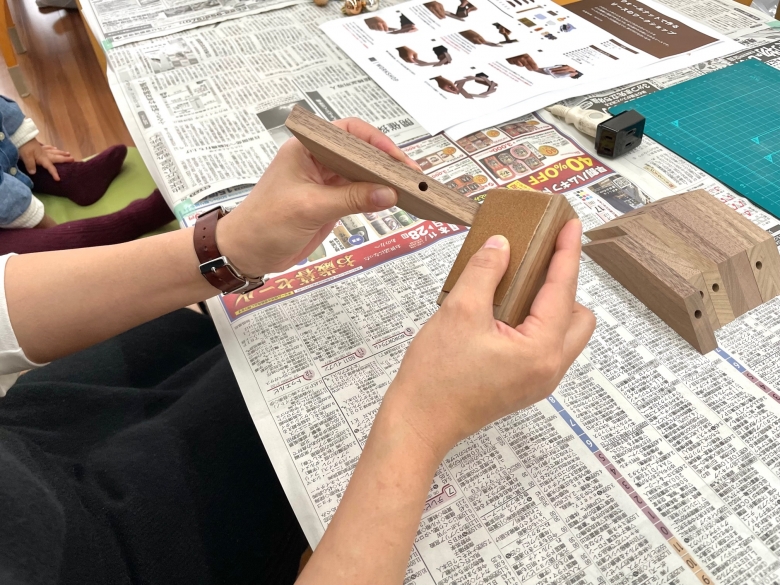 木をヤスリで磨くところから、組み立て→オイル塗り込み→飾り付けとみなさん楽しんでいただき、思い思いの素敵なウッドリースが出来上がりました☆
