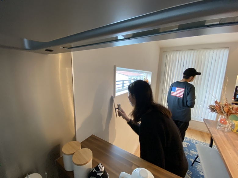 ちょうどお引渡しより2年経った定期点検の様子です。少し気になった壁のヒビや傷を左官職人さんの指導のもと、お施主様と一緒に手直ししました。