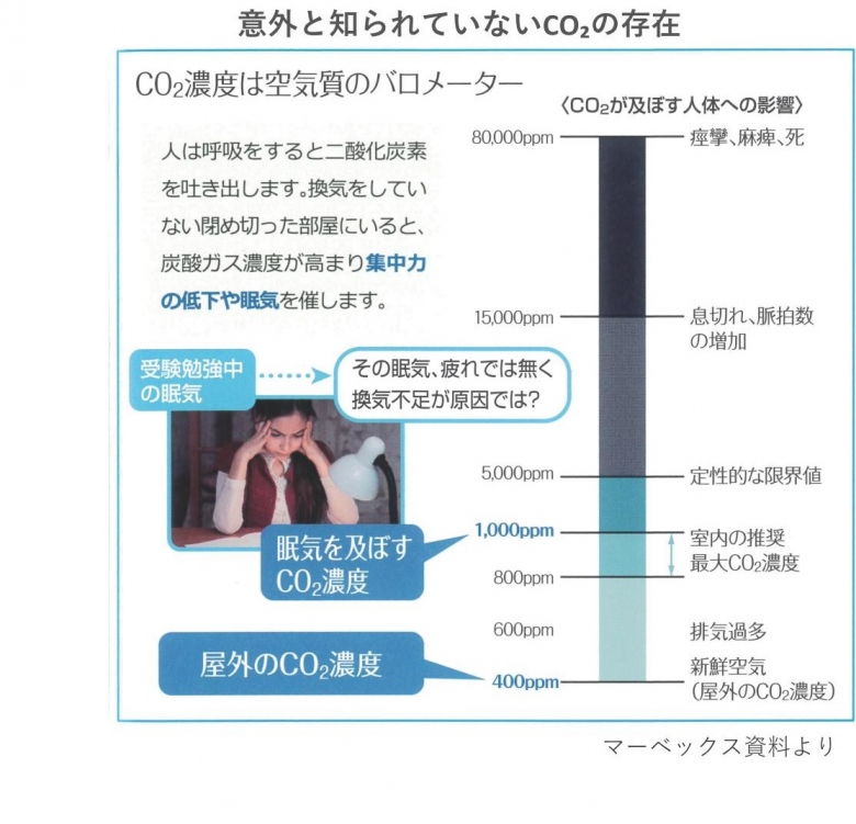 基本的には、外よりも室内の方が空気が汚れています。そこで定期的な『換気』で空気をきれいにすることが大切です。生活で何気なく換気をすることにより学習効率向上、喘息・鼻炎の予防、睡眠の改善への効果が期待できます。私たちの体は、1日に約2万回の呼吸を繰り返し、およそ15㎏の空気を取り込んでいます。食べ物は1日約2㎏の摂取と考えると、呼吸の大切さが理解できます。