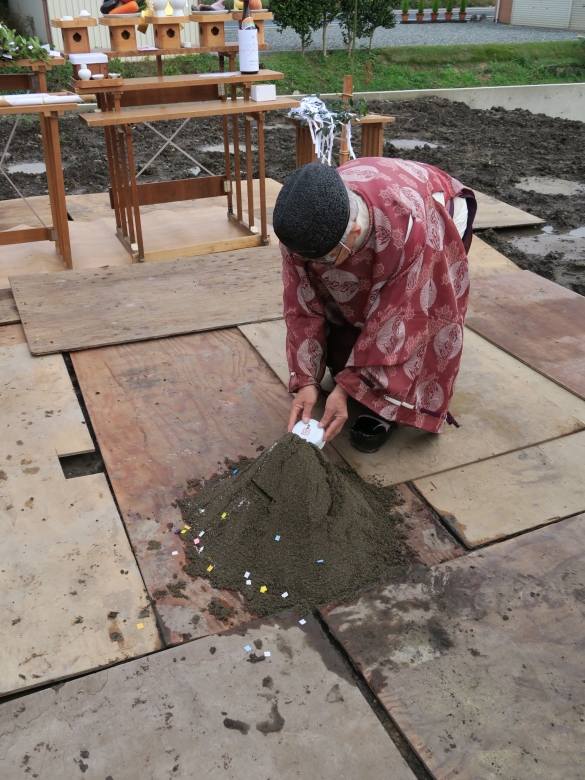 神主さんが、切麻(きりぬさ)という和紙と塩、