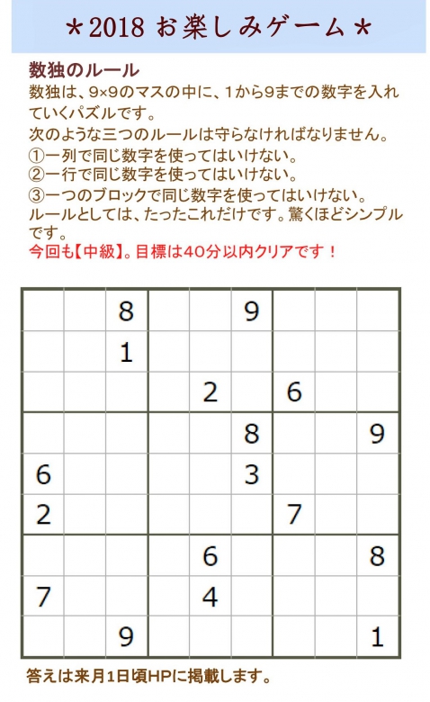 9月号の数独パズル中級編でした。
