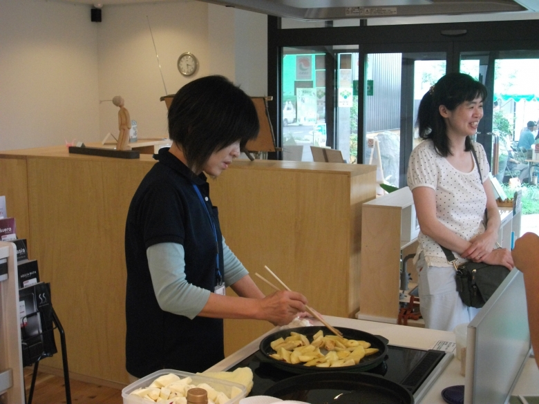 そして、ちょうど3時のおやつが食べたい!という頃に、当スタッフが店内のラジエントヒーターを使い、大学いもを作りました。すぐにおいしそうな甘くていい香りが漂い、キッチンの回りはぐるっとお客様で囲まれました