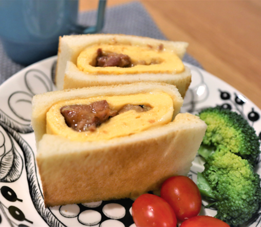 甘辛たれのやきとり缶を卵で巻き上げ、トーストした食パンでサンド!お好みでマヨネーズにからしを加えるとピリッと後をひく美味しさに!これから暖かくなるのでピクニックのお供にいかがでしょうか?