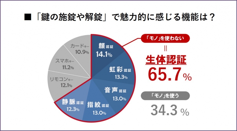 YKK APが行ったアンケート結果では、玄関の施解錠に用いる機能として、この顔認証を含む生体認証(3D認証)に関心を示す人が約66%でした。