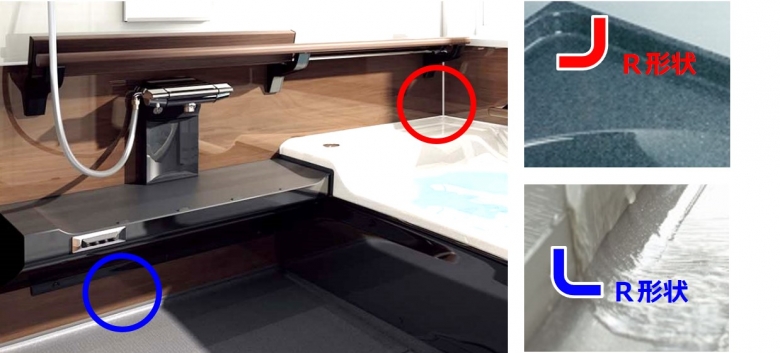 アクリアバスの床・浴槽のカビの根が生えやすい部分は、R形状の設計で、カビの根が生えにくいです。また角のない特殊形状のため、お掃除もしやすいです。