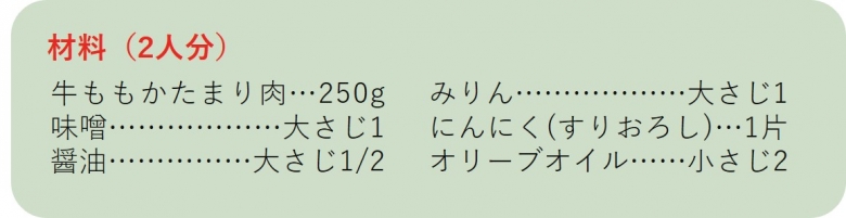 ポリ袋に味噌、醤油、みりん、すりおろしたにんにくを入れて混ぜ、粗熱のとれたの牛肉を入れて、よく揉み込む。そのまま冷蔵庫でひと晩漬け込む。