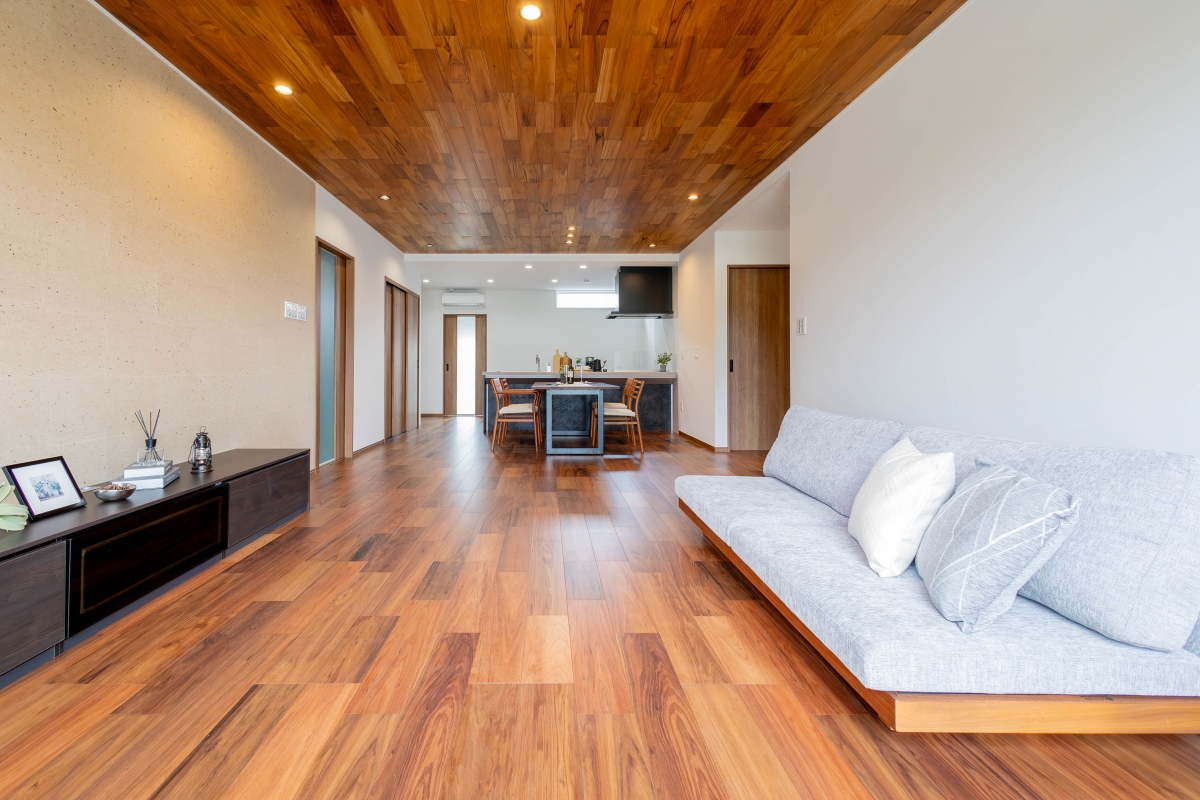 天井は、一段高く設計し、チークの突板で仕上げました。ぬくもりのある木目が空間に奥行きと上質なアクセントを与えます。床にはアカシアを使用。自然の濃淡が美しく、落ち着いた空間に。