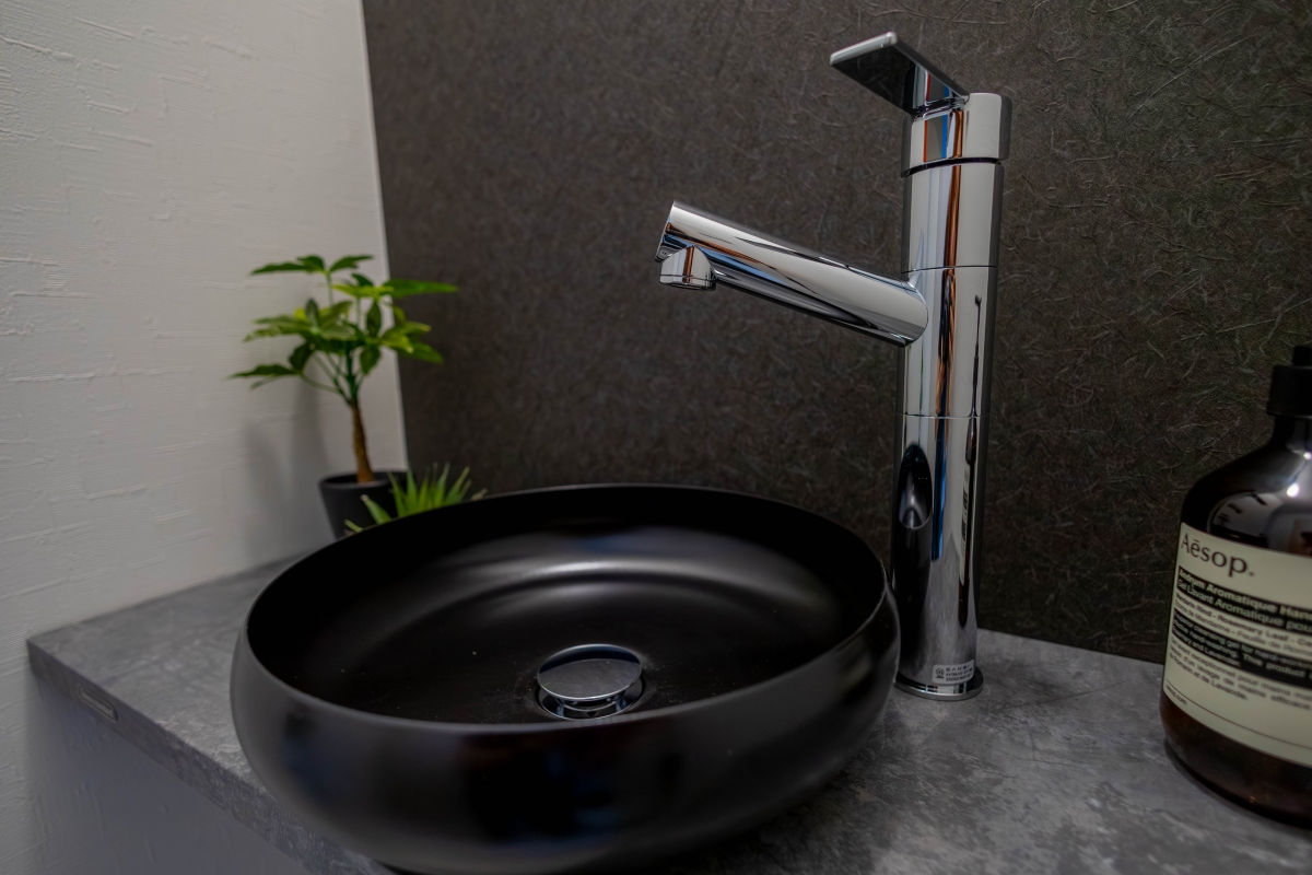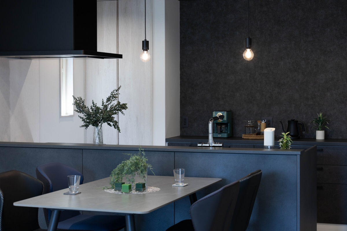 玄関を入ってすぐ右手にキッチンがある、使い勝手の良い動線設計。買い物帰りも荷物をそのままキッチンへ運べ、家事ラクを叶える間取りです。キッチンはブラックを基調に、天井まで統一感のある下がり天井で空間に奥行きと落ち着きを演出。システムキッチンの扉は「ルーナストーンダーク」を採用し、上質なマットな質感が魅力です。背面収納とも調和し、デザイン性と実用性を兼ね備えた、心地よいキッチンが完成しました。