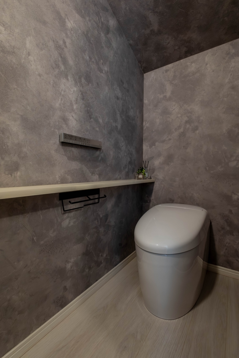正面から見た際の美しいラインと、すっきりと整ったファサードが印象的な外観。外壁にはKMEWの「シュトラール マックス チタンブラック」を採用し、重厚感とシャープさを両立しています。玄関まわりには、質感豊かな「フィエルテ チタンホワイトマーブル」をアクセントとして用い、モノトーンの中にもやわらかさと上質さを感じられるデザインに仕上げました。シンプルながらも洗練された佇まいが、街並みに溶け込みながらも個性を放つ一棟です。