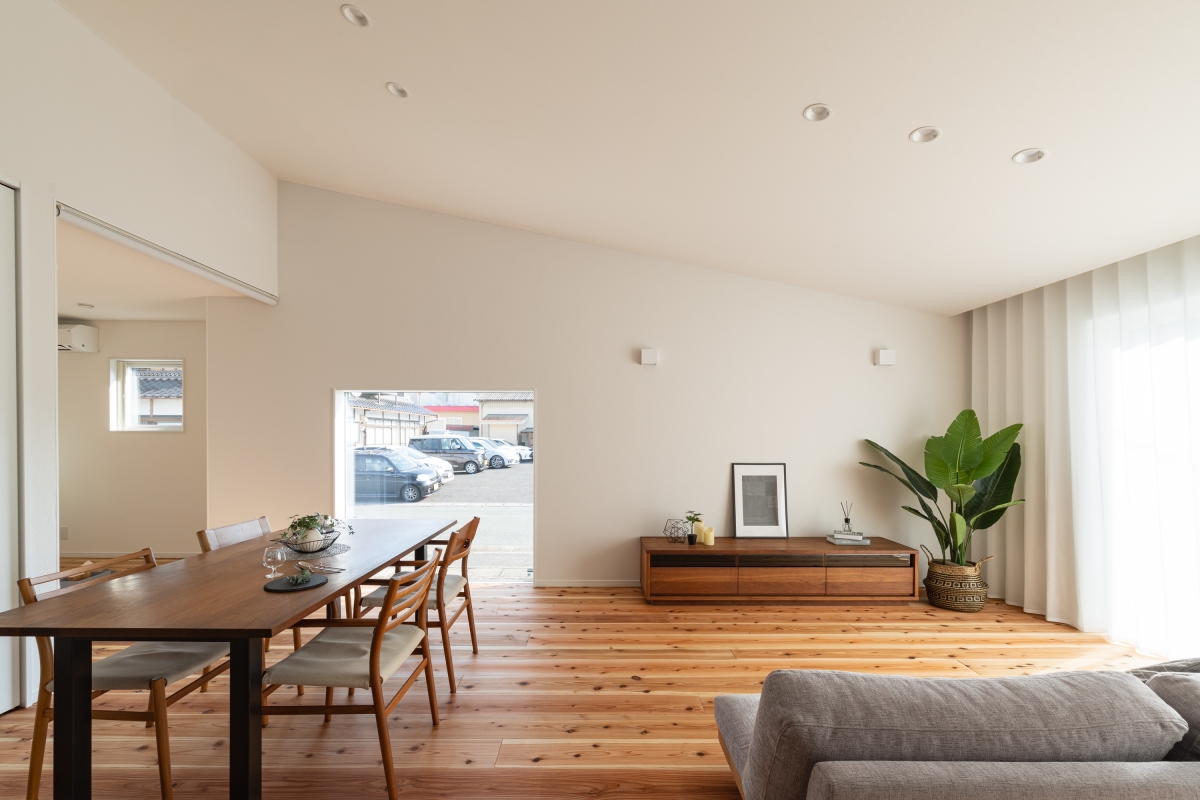 GX補助金の獲得を見据え、南面に太陽光を搭載した省エネ性能の高い平屋住宅です。将来分室可能な洋室を隣接し、約25帖のLDKを実現しました。勾配天井と杉の無垢床が心地よい開放感を演出。玄関から家中を回遊できる動線と、ランドリーとWICを直結した効率的な家事動線も魅力です。収納も約8帖分確保し、性能と暮らしやすさを両立しました。