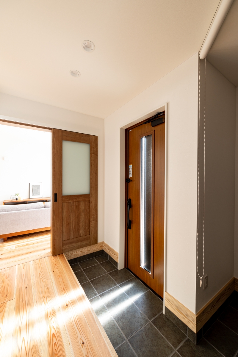 玄関からリビング、キッチン、ウォークインクロークへ直接つながる、使い勝手のよい動線。帰宅後すぐに上着やバックを置ける、買物帰りは、そのままキッチンへ―そんな日常の動きもスムーズに。家中をぐるりと回遊できる間取りは、毎日のストレスを減らします。