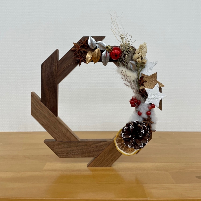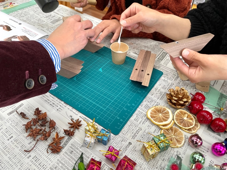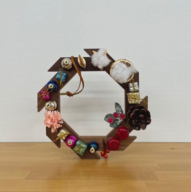 ワークショップでは、ウォールナットを使ったウッドリースを作成。