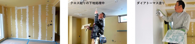 どちらも下地処理が大切になります。ボードのジョイント部分、ビス穴をパテで埋めてからクロス、塗り壁を施工していきます。パテの施工が甘いと、表面までボードのジョイント部分やビス穴が浮き出てくることがあります、またパテも乾燥すると痩せてきてしまう為、何度か重ね塗りをして凹凸を無くし平らにしていきます。とても手間がかかりますが、綺麗な仕上がりにするために徹底しています。