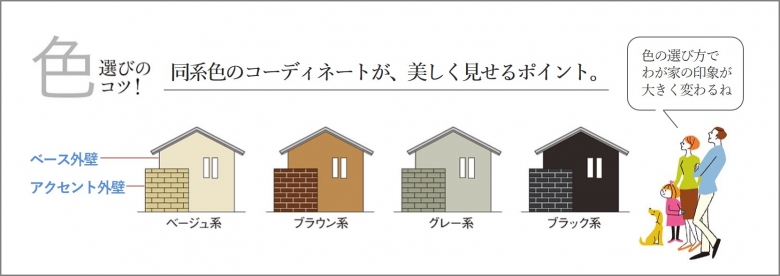 ベース外壁とアクセント外壁を同系色で組み合わせることで、まとまりのある外観に仕上げることができます。
