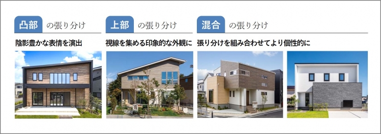 自分らしい外観を演出する為に、外壁の張り分けを取り入れてみましょう。家全体の雰囲気を左右するベース外壁、個性を引き出すアクセント外壁を組み合わせます。