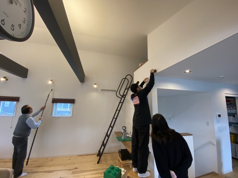 ちょうどお引渡しより2年経った定期点検の様子です。少し気になった壁のヒビや傷を左官職人さんの指導のもと、お施主様と一緒に手直ししました。