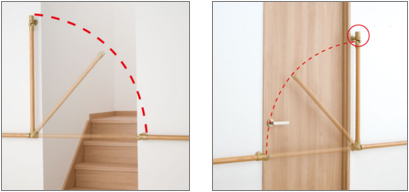 本来、ドアや階段の前には手すりを取り付ける事ができません。しかし、「遮断機手すりブラケット」を使えば、ドアの前などでも連続手すりを実現する事ができます。