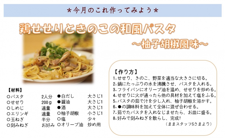 せせりときのこの和風パスタ~柚子胡椒風味~