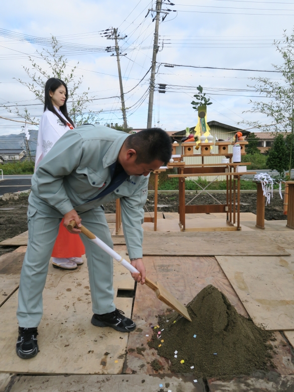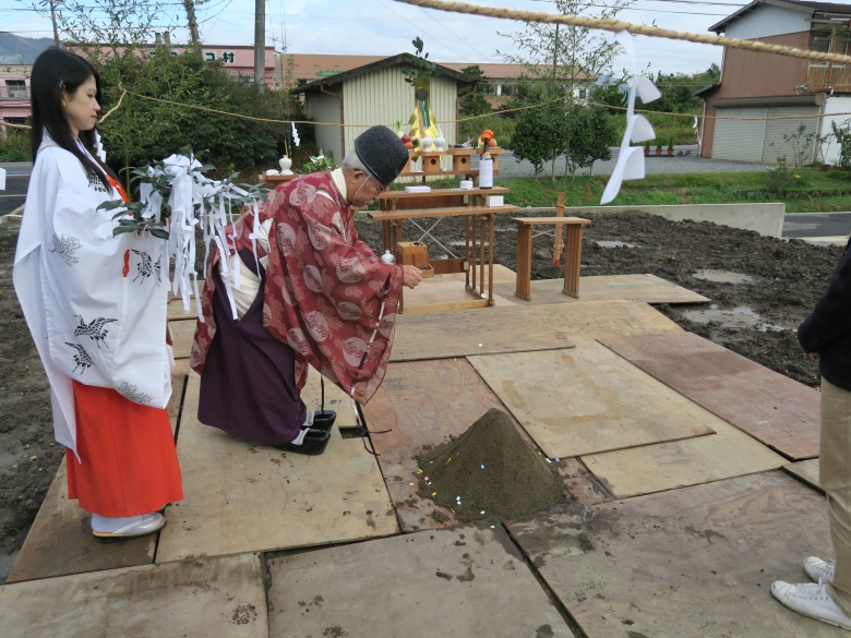 神主さんが、切麻(きりぬさ)という和紙と塩、