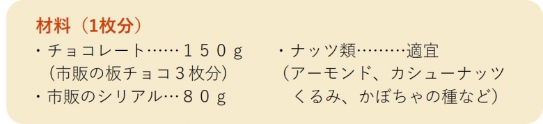 材料のチョコやシリアルの種類はお好みのものを選んでください。上に乗せるナッツも自由です。簡単なのでお子様と一緒に作るのもおすすめです(*^^*)