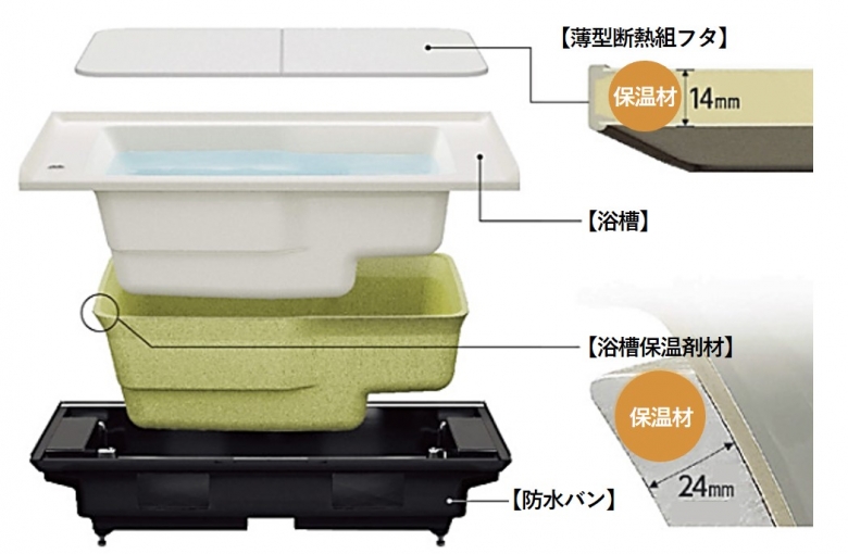 浴槽を下からまるごと保温材でカバーしました。また、薄くて扱いやすい風呂フタも保温仕様。上からも下からも保温することで、 4時間でも温度低下はわずか2.5℃。お湯の温度をあたたかいまま、次の人まで長く保ち続けます。