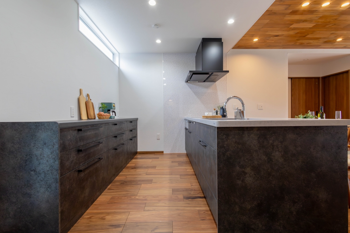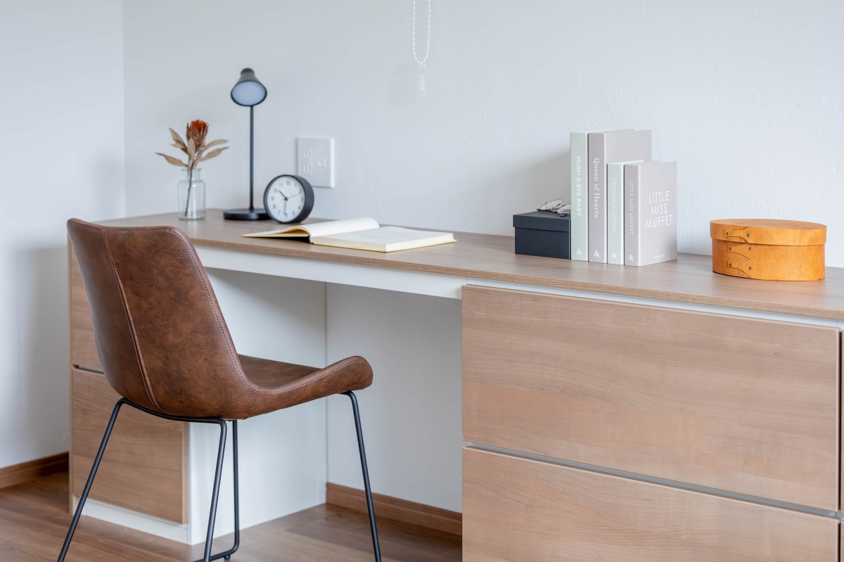 広々カウンター&たっぷり収納で、家時間もがもっと快適に。ダイケンの造作家具を設置し、書類を広げられるゆとりのカウンターと、大容量の収納が魅力です。趣味や仕事、家事スペースとしても活躍します。