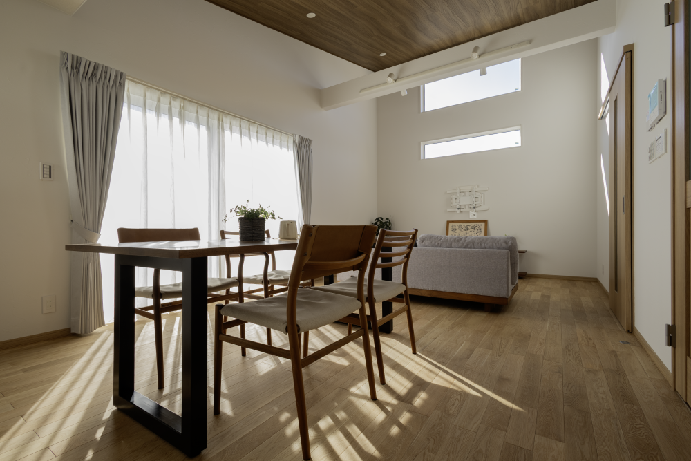 高窓から降りそそぐ、やわらかな自然光。高窓が、時間帯によって異なる柔らかな光を室内へ届けます。眩しくないのに明るい、住む人にやさしい採光計画が魅力です。