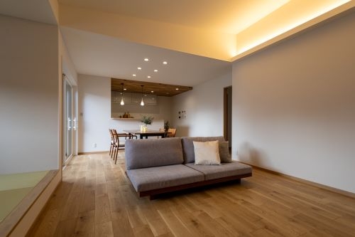 リビングの一角に小上がりの畳スペースを。3畳という広さは、くつろぎにも実用にも使いやすい“ちょうどいい”サイズ。お子さまの遊び場やお昼寝、来客時の腰掛けスペースとしても活躍し、日常に和の落ち着きをプラスします。