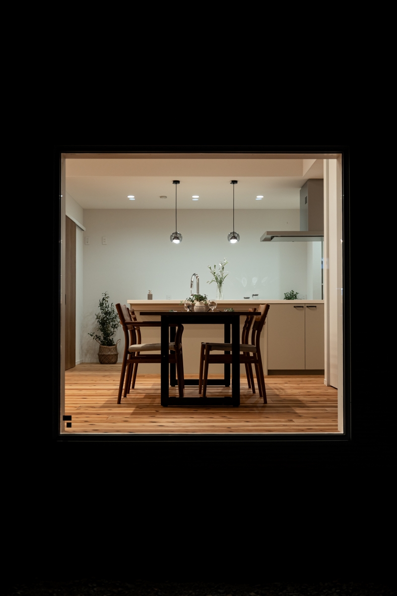 勾配天井が生み出すのびやかな20帖のLDK。昼間はリビングの窓から、レースのカーテン越しにやわらかな光が差し込み、明るく心地よい空間を演出。夜は間接照明がドラマチックに灯ります。